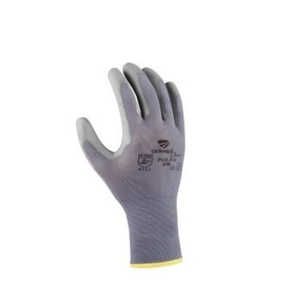 Luva de cinco dedos completamente em poliester cinza com revestimento na palma e dedos em nitril.